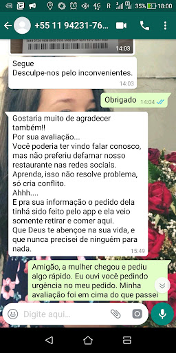 Read moreA PIOR EXPERIÊNCIA POSSÍVEL, PENA QUE NÃO PODE DAR MENOS DE 1 ESTRELA, FIZ UM PEDIDO PELO APP PARCEIRO DELES, PASSOU MAIS DE 1 HORA E MEIA, NÃO RECEBI O PEDIDO, NÃO ME LIGARAM, NÃO ME CHAMARAM NO CHAT, E QUANDO VI QUE JÁ HAVIA DEMORADO MUITO ENTREI EM CONTATO E ME INFORMARAM QUE ELE HAVIA VINDO MAS NÃO NOS ENCONTROU, O PORTEIRO MISTERIOSAMENTE SUMIU E NÃO O ATENDEU, O INTERFONE QUE FICA NO PORTÃO DEVE SER DE ENFEITE TAMBÉM, FORA ISSO COM DUAS CRIANÇAS EM CASA ESPERANDO A ÚNICA RESPOSTA QUE TIVE FOI (ELE JÁ FOI EMBORA E NÃO CONSIGO FAZER MAIS NADA).. EXCELENTE...