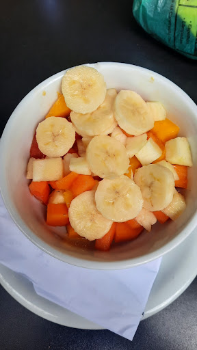 Depois de passar na frente do Alfamas e ver a padaria em reforma, levei a turma do grupo de corrida até o Bread & Co. Já tinha ido nesta padaria há alguns anos atrás....e sempre gostei do ambiente com as mesas do lado de fora. A galera curtiu bastante o ambiente e virou uma outra opção para um café pós-treino. Os atendentes deram conta de montar uma mesa e atender as 14 pessoas que ali estavam na nossa mesa. Meu pedido foi uma salada de frutas. Apesar da apresentação ser bem simples, veio uma porção generosa de frutas como abacaxi, mamão e banana. Pelo preço praticado poderia vir outras variedades de frutas, como: morango, kiwi e/ou manga. Deixaria o bowl mais atraente para comer. Uma coisa que senti falta na padaria foi o balcão de doces, achei bem estranho uma padaria não ter bolos, éclairs, mini tortas e outros doces. Mas para um café da manhã tem boas variedades no cardápio. Dou 3 estrelas para a comida pq achei que poderiam valorizar um pouco mais a apresentação colocando outras frutas que deixassem o bowl mais atraente.
