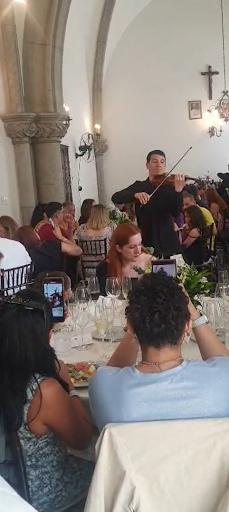 Iniciamos o passeio com o brunch, que foi uma experiência deliciosa. Havia grande variedade de comidas e bebidas à vontade, além de sobremesas impecáveis. Tudo estava muito bem preparado e saboroso. Almoçamos ao som de um excelente violinista, ouvindo belas canções e até a sanfona tocada pelo próprio padre, o que criou uma atmosfera encantadora e nos transportou para outra época. Embora o valor do ingresso possa parecer alto, é importante destacar que parte da renda é revertida para o cuidado de famílias em situação de vulnerabilidade, o que torna a experiência ainda mais gratificante, em sintonia com o princípio da caridade, tão essencial à Igreja.