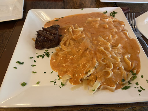 Até aí tudo certo, comemos as empanadas de entrada, mas quando chegaram os pratos, nos deparamos com esse absurdo que vocês podem ver na imagem. O filé mignon era MINÚSCULO, chega a ser vergonhoso ofertarem um prato desse valor e entregarem esse petisco. A massa, claramente de pacote que se encontra em qualquer mercado, não se deram ao trabalho nem de utilizar uma massa fresca no prato. E como se não bastasse, no momento da escolha da sobremesa, a opção de fruta era um simples pedaço de melancia ou abacaxi, tendo que escolher apenas uma delas.