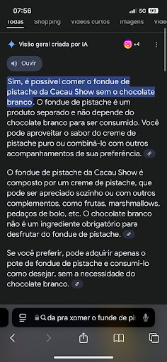Pedi um fondue de chocolate ao leite e um fondue de pistache. No momento do pedido, percebi uma reação estranha dos atendentes, como se estivessem cochichando. Entendo perfeitamente que, por estar próximo das 20h, todos já estavam cansados e ansiosos para encerrar o expediente.