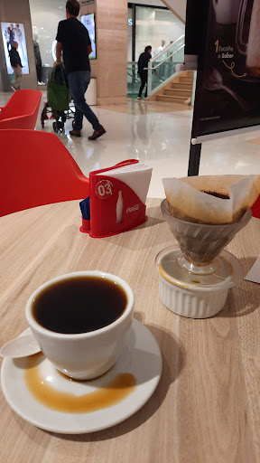 Queria dar uma variada na pausa para um café após andar pelo shopping e acabei indo no Café do Ponto. Apesar de ser uma cafeteria, não sabem preparar um café e nem explicar sobre os grãos utilizados por eles. Ao fazer o pedido perguntei para a atendente qual grão que eles utilizavam no método coado e ela se limitou a dizer, na má vontade, que era: reserva especial, exportação e o aralto. Esperava uma apresentação melhor dos produtos, mas com essa má vontade optei logo pelo reserva especial. Uma outra atendente trouxe a xicara, o método V60, a água numa garrafa térmica 🙄 e um potinho para apoiar o porta filtro após a extração. Ponto negativo já começa por não escaldar o filtro de papel. Isso faz com que junto com a extração da bebida venha o gosto de elementos químicos do processo de branqueamento do filtro de papel. Na sequência, ao extrair o café poderiam usar uma chaleira ao invés de uma garrafa térmica. Para fechar, despejaram mais água que a xícara comporta. Resultado, o café transbordou. Falta treinamento e simpatia para alguns funcionários do quiosque.