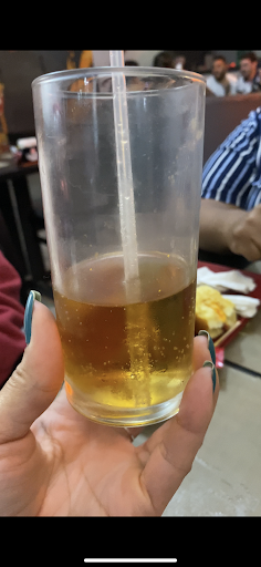 Agora o que mais me deixou brava por ter escolhido esse lugar foram os copos, olha a cor do copo que mandaram pra gente (olhar a foto), na foto está sujo sim, porque a criança que estava tomando refrigerante nele estava com a mão suja de cheddar, mas dá pra ver bem que o copo estava ENGORDURADO! Onde eles servem o suco na lâmpada, estava sujo no bocal (olhe a foto).