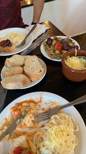 Para começar, a mesa de antepastos era extremamente simples. Um pratinho minúsculo com algumas azeitonas murchas, uma caponata de berinjela sem graça e um pão italiano sem frescor. Nada lembra a fartura e variedade típica de uma boa cantina italiana.