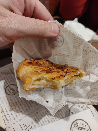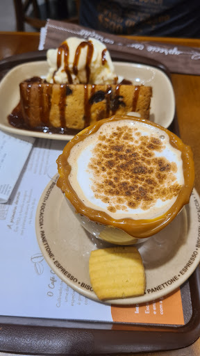 Read moreHoje estive a tarde com minha filha e infelizmente não agradou o serviço. A caixa nem perguntou sobre CPF para acúmulo pontos( como estava com uma bebê, no momento não me atentei) e qdo me lembrei a menina falou que não dava mais para colocar. O cappuccino estava bem ruim( puro gosto somente de canela) sem gosto de chocolate e qdo indaguei disse que já vem a medida certo, porém polvilhou um pouquinho de chocolate em pó mas nada tirou o forte gosto de canela que no final estava tudo no fundo da xícara. O frappé que minha filha tomou também estava mal feito( muito doce) e pouco batido. Obs. Gosto muito da bauducco e não sou de reclamar, mas hj infelizmente não agradou e não ficou nada barato, pois comemos também 2 fatias...