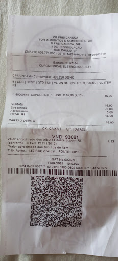Cumprimentando-os(as), venho informar que ontem, após às 19h, fui acompanhado à Casa Bauducco, no Shopping Frei Caneca. Comprei um capuccino (Extrato n° 57164) e solicitei ao atendente Rafael a inserção de meu CPF para fins de pontuação no programa de fidelidade da casa. Efetuei o pagamento e, posteriormente, decidi comprar um pão de queijo de multigrãos e um muffin de laranja (Extrato n° 57165). Antes de efetuar o pagamento da segunda compra, perguntei ao citado atendente se ele havia posto meu CPF, ao passo que ele hesitou um pouco e disse que sim, mas achei estranho posto que ele não tinha solicitado novamente meu CPF e não havia possibilidade de ter decorado o número. Então solicitei que me enviasse as NF's quando fossem levar os pedidos. Ocorre que meus pedidos chegaram, entregues por uma atendente, e não vieram com as respectivas notas fiscais. Estranhei o comportamento, pois costumo ir à Casa Bauducco com frequência e as notas fiscais sempre vêm acompanhando a entrega dos produtos. Então solicitei minhas notas fiscais para a atendente, que entrou e me trouxe as notas. Verifiquei que a primeira nota consta um CPF que não foi o que informei e a segunda nota não consta CPF. Surpreso com a postura do atendente, me dirigi ao interior do estabelecimento e somente a atendente estava presente, perguntei pelo atendente Rafael, ao passo que fui informado que estava em horário de almoço. Pedi para falar com o gerente ou dono, e fui informado que ela estava sozinha. Pedi para que inserisse meu CPF nas notas e ela me informou que era novata e disse que não havia mais possibilidade de inserção do CPF após o fechamento das notas. Relatei para ela do ocorrido e a mesma disse não concordar com a postura do atendente Rafael e me orientou a abrir ocorrência pelo site da Casa Bauducco e que o nome do dono é Thiago. Ante o exposto, solicito à Casa Bauducco providências para que não haja mais este tipo de procedimento que repercute negativamente para este estabelecimento e solicito, por gentileza, a inserção das notas fiscais de minhas compras. Envio em anexo fotos das notas fiscais para fins de providências. Grato pela...