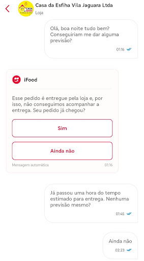 Read moreQualidade deprimente. Carne com gosto e cheiro de estragado, colocam quantidades absurdas de temperos para disfarçar o cheiro e o gosto terrível, um pedido pequeno e conseguiram errar. Três esfihas de chocolate branco e enviaram as três de chocolate, além da demora na entrega. Não respondem chat e quando respondem colocam alguém que não sabe escrever, tornando impossível a comunicação entre o cliente e a loja. Já foi muito bom anos atrás com a qualidade excelente mas hoje em dia parece que colocam resto para vender. É impossível até de comprar os salgados prontos na loja pois as atendentes não sabem os sabores e erram até no básico. Falta de profissionalismo e treinamento dos funcionários, parece que estão fazendo favor para os clientes, não dão bom dia/boa tarde e olham para sua cara com cara fechada. Espero que treinem melhor os funcionários e melhorem a qualidade, até porquê...