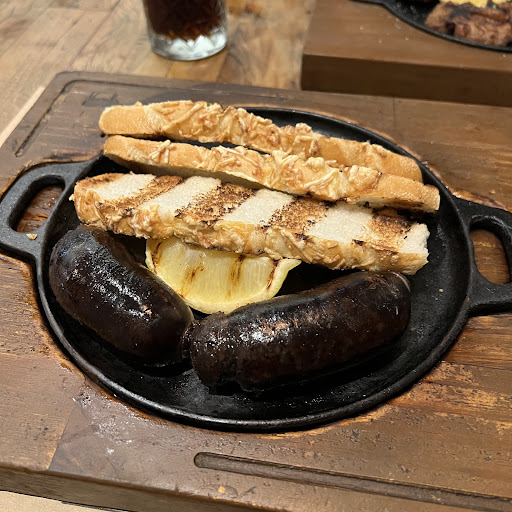 As morcillas, embutidos feitos com sangue de porco, têm um sabor levemente adocicado, com notas de condimentos, nozes e uvas-passas, presentes na receita da casa. A textura é cremosa ao parti-las e eu, particularmente, gosto de passar no pão (que, inclusive, é excelente) e finalizar com um toque de limão e pimenta.