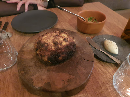 Couvert: Broa de milho e erva-doce assada na hora no forno à lenha, manteiga preparada e defumada na casa, escabeche de cebola e pimentões na brasa e finalizado com ervas.