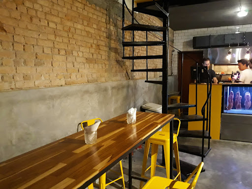 O local é pequeno. Sentamos no térreo, onde há poucas mesas e algumas banquetas. Existe um andar acima, onde fica o banheiro, mas sinceramente, recomendo ficar no térreo. O piso do 1º andar tem o aspecto sujo, e havia um pano molhado jogado no chão. Há apenas um balcãozinho com algumas banquetas e um banco de praça, iluminação ruim; sinto que não seria agradável comer ali. O banheiro é espaçoso, mas há um barulho de alguma turbina perto da janela, que parece não arejar muito. Aliás, para acessar o andar é necessário subir uma daquelas escadas caracol, então se você possui algum problema de mobilidade, talvez não consiga utilizar o banheiro.
