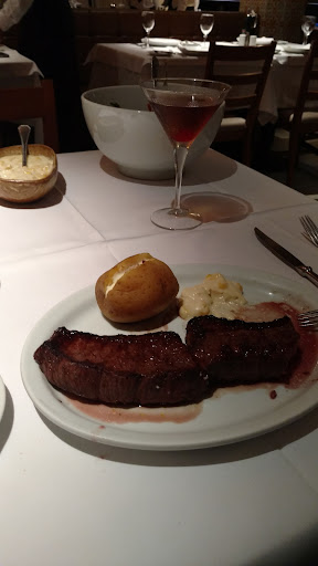 A traditional steakhouse serving premium grilled meat, with a buffet, in a spacious dining area.