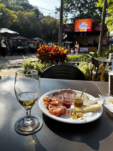 Sentamos na área externa, que tem uma vista maravilhosa para o palco e ainda estava iluminada pelo sol. Sobre a mesa, havia dois cardápios: um de drinks e outro de porções. Como não conhecíamos o local, pedi ajuda a uma atendente externa — uma mulher morena, de olhos puxados, cujo nome infelizmente não sei.