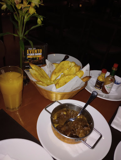 🍴 Refeição: De entrada, experimentei o “Filé ao Molho Madeira”. Eu que sou apaixonado pelo “Camarão Jangadeiro” resolvi pedir outra entrada pra diferenciar. Gostei muito dessa em que vem pedaços de carne com molho madeira e champignon, acompanhado de uma cesta de torradas temperadas que são bem crocantes e combinam bem com a carne. Quanto ao prato principal, pedimos o “Camarão Coco Bambu” da promoção do Galvão Bueno. O prato vem com 6 camarões bem grandes, recheados com catupiry e empanados, além de um arroz cremoso com pequenos camarões, ervilhas, presunto, queijos muçarela, parmesão, molho branco e batata palha por cima. Gostei muito de todo o sabor do prato, principalmente dos camarões com catupiry, que são inspirados na entrada que sou fã. Apesar da casa dizer que o prato serve 2 pessoas, na verdade poderia servir 3 de tão generoso. Por fim, quanto aos sucos, pedimos de maracujá e de laranja. Ambos estavam muito refrescantes.
