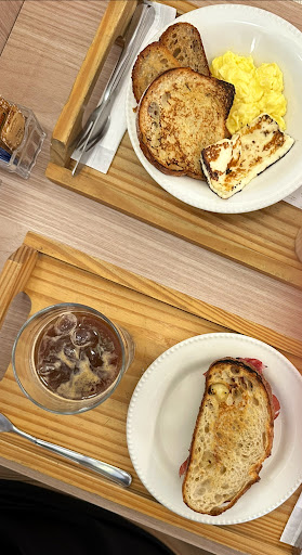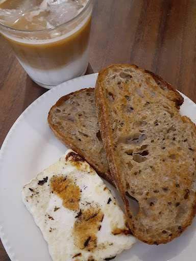 Eu escolhi o pão na chapa acompanhado de um queijinho, também na chapa, tudo muito bom. Pra beber foi um latte gelado, que estava ok.
