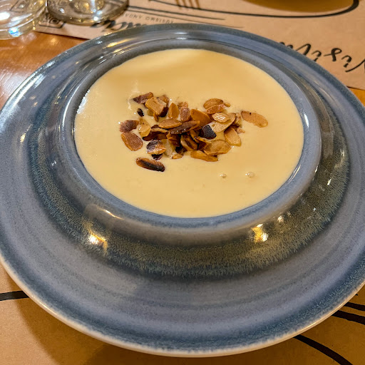 Para começar, o ajo blanco é a primeira versão do conhecido gazpacho. Inventado na Península Ibérica pelos muçulmanos, antes de Colombo trazer cebola, tomate e pepino para a Espanha, é feito com amêndoas, alho, pão, água, azeite, vinagre e sal. Tem textura cremosa e homogênea, sabor levemente ácido, com notas amendoadas e agridoces, reforçadas pelo crocante das amêndoas fritas e pelo dulçor delicado das uvas frescas.