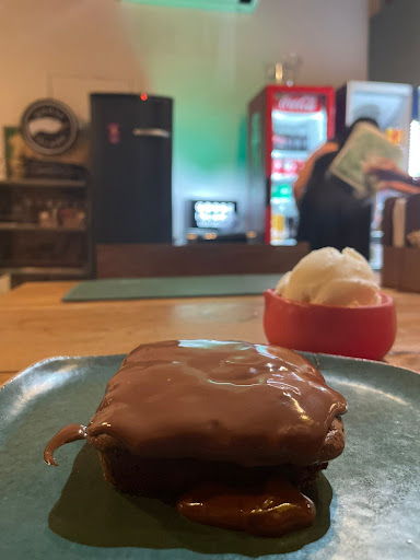 O brownie com sorvete estava gelado e duro, como se tivesse acabado de sair da geladeira.