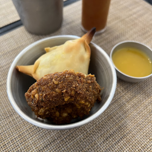 Das entradas, a samosa é uma espécie de pastelzinho com massa bem crocante, e recheio úmido e bem temperado de batata, ervilhas e especiarias. Nas especiarias, aliás, é possível sentirmos dulçor, uma levíssima picância de páprica e cominho. Ao seu lado, a vada é um bolinho de lentilha vermelha crocante por fora, macio por dentro e com um leve dulçor. Ambos acompanham um ótimo chutney de manga.