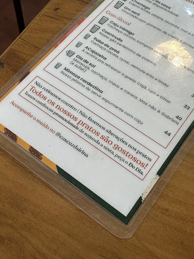 Comida: Nada de excepcional. O Caju Inimigo foi a unica coisa que pedi que senti que valeu a pena. A quantidade em si dos pratos foi o que me chamou mais à atenção... Um queijo coalho com melaço de um tamanho minisculo até para uma entrada. O caldo de sururu idem, mas para um caldo de entrada, até foi compreensivel, mas o queijo realmente foi até chocante. A apresentação simplória, sem nenhum atrativo. O drink servido em um copo americano pequeno (mas não enganam ninguem, tem no cardapio o desenho dos copos) Não é porque é uma comida nordestina/nortista, que tudo tem que ser um ''simples forçado''. Lá no norte ninguém serve drink em copo americano pequeno e deixa a experiencia como se voce tivesse tomando um copo de água... fica até um pouco caricato querer forçar essa simplicidade. Os talheres, apesar de bonitos, descascados para um local de valor mais elevado, isso precisa ser levado em consideração porque se saimos de casa para pagar este preço também é sobre a experiência, senão comeriamos em casa, certo?