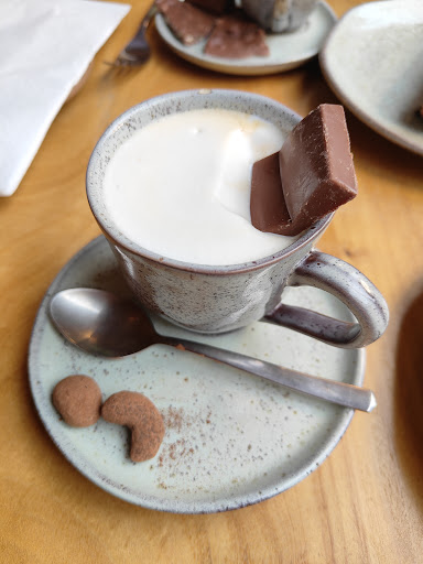 When I got seated I ordered a cappuccino and cake. I waited a while to receive my order. The chocolate cake was really mediocre. It seemed old and dense. The different types of ganache weren't that good either. The cappuccino arrived barely lukewarm. The chocolate that was on top of the cake was really good, but that's the only highlight. Even the nibs on the side seemed off.