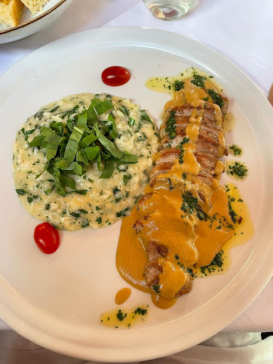 Comida: 9/10 Sabor: pratos estavam excelentes. Peixe com molho de camarões, aspargos e purê de batata. Delicioso, tudo no ponto, bem temperado e muito saboroso (9/10). Filé de leitão com molho mostarda (9/10) e risoto de rúcula. O filé de leitão estava bem macio e no ponto, e o molho super saboroso. Apresentação: Pratos bonitos e bem montados. Tamanho da porção: Boa, mas para nós valeu pegar uma entrada/couvert ou sobremesa para complementar. Couvert estava muito bom, um pão com cebola muito saboroso, e outro italiano normal fatiado, com potinhos de manteiga e tomates picados temperados. Ficaria melhor se os pães fossem um pouco aquecidos. Sobremesa: comemos uma torta de maçã quente com sorvete de canela (8/10). Estava uma delícia. A torta não é muito fácil de cortar, mas é bem recheada/alta, e o sorvete muito saboroso. Cardápio: bem variado. Bastante opção de massas, mas várias de carnes/risotos/peixes também. Tanto opções simples como combinações mais interessantes e complexas.