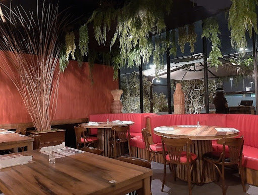 Na entrada do restaurante em frente ao shopping, uma área externa de convivência com confortáveis sofás de ratan e algumas mesas, além de uma recepção. Iluminação e paisagismo composto por árvores e flores, dão as boas vindas ao cliente.
