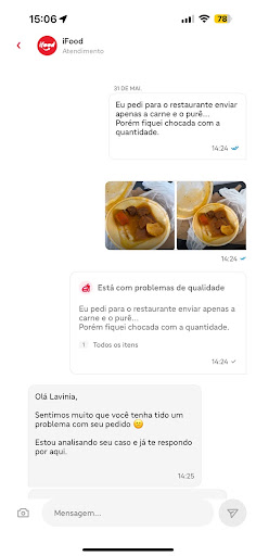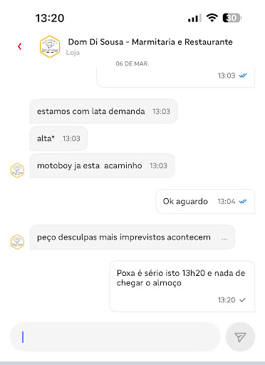 Horrível, minha esposa fez um pedido pelo iFood para almoçar, ela pediu para manda só purê e carne sem arroz e feijão e eles mandaram três pedacinho de carne um pedaço de cenoura e um pedacinho de batata e quando ela tentou falar com eles… falaram que não poderia fazer nada. Ela encaminhou o ocorrido para o iFood e quando o iFood foi resolver o estabelecimento mandou o motoboy bem mal educado, xingando e chamando minha esposa de pilantra e passa fome, isso é uma absurdo como pode ter uma empresa desse jeito ? vou tomar providências sobre isso. Até agora estou esperando o estabelecimento da uma...
