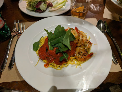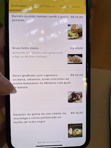 COMIDA Pedimos um carpaccio comum com salada e pinoli. Eu gostei, a minha esposa achou um pouco sem graça. Eu pedi uma costeleta de javali ao molho de porcini fresco acompanhada de um tagliatelle na manteiga e sálvia, tartufado. Acreditamos que a carne foi cozida utilizando a técnica do sous-vide (pudemos ver na cozinha vários alimentos sendo embalados a vácuo e daí concluímos) e finalizada no forno. A carne estava gostosa mas a massa embora saborosa, cozinhou demais. A minha esposa comeu um raviolini de queijo caccio cavalo ao molho de espinafre, tomate assado, pinoli e grana padano crocante. Assim estava a descrição no cardápio, perguntei sobre o queijo que não conhecia mas quando provei não vi a menor diferença para a boa e velha muçarela. Estava gostoso mas o molho de espinafre (que fez o desempate na minha escolha) não passava de folhinhas cozidas da verdura. Me irrita muito descrições de pratos mal feitas, fica a sensação de comprar gato por lebre. Os pratos vieram num bom tempo, estavam quentes mesmo que o meu tenha ficado por algum tempo abandonado no balcão esperando a finalização do outro prato. Não havia decoração ou nenhum tipo de apresentação especial no nosso pedido.
