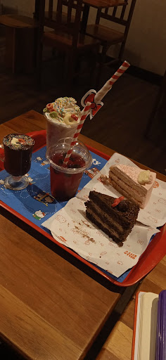 Pedimos uma fatia do Bolo de Frutas Vermelhas (R$17.90) e uma fatia do Bolo de Chocolate (R$17.90). Os dois estavam muito bons, o pedaço é até que grande (e deveria ser mesmo, por esse preço), e não é aquele doce enjoativo. A massa era fofinha e estava bem recheadinho, muito gostoso. A única coisa que eu reclamaria nisso tudo é dos chocolates que vem em cima, pra decorar a fatia (aqueles com a carinha da Hello Kitty ou em formato de lacinho), porque eles são absurdamente doces, tipo, muito mesmo.