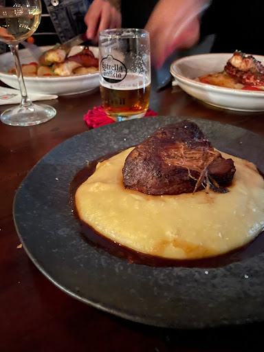 Read more📍El Mercado Iberico 💭 #barriguetagosta 🍽️ Comida: 7/10. Croqueta de jamon 4un R$36 senti mais o “cream cheese, não sei o que era” do que o jamon. Achei ok. Papas bravas e aioli R$28 muito gostosas! Arroz de porco e camarões R$84 o arroz estava um pouco salgado. O porco estava saboroso. Pulpo, mil hojas de patata fritas y romescu R$94 O polvo passou um pouco do ponto, estava um pouco duro. Maminha, purê de mandioca e queijo manchego R$88 a maminha estava um pouco seca, acho que tbm passou um pouco do ponto. 🙋 Serviço: 8/10. Muito atenciosos, mas os pratos demoraram bastante para chegar. 🛤️ Ambiente: 10/10. Bem agradável! Sentar na varanda foi bem agradável. Ponto de oportunidade é que não tem vallet e os estacionamentos fecham cedo, o que fecha mais tarde fecha as 22h. 💰 R$170 por pessoa com bebidas 🗂️ Repertório: Tanit e Adesão Santiago são restaurantes espanhóis que gosto muito. Tem o Torero Valese que dizem ser muito bom...