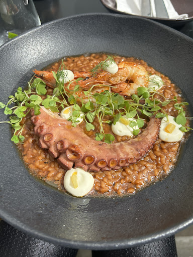 Read moreAmbiente ótimo. Atendimento ótimo, porém o que se pede demora a vir. Comida boa, bem feita e saborosa, apresentação do prato bem bonita, porém mal servido. Perguntamos se o prato era individual, o garçom respondeu que era bem servido que daria para duas ou até 3 pessoas, ele ainda gesticulou mostrando que o prato era bem cheio. Como estávamos em 5 pessoas, perguntamos, então, se dois pratos do arroz de polvo nos serviria. Ele disse que sim. Quando os dois pratos chegaram, fiquei com vergonha dos meios convidados. O arroz de polvo que estava muito bom, apesar de um pouco duro, foi servido apenas um fundinho de prato que julgo suficiente para uma pessoa apenas. Ficou uma situação constrangedora. Nossos convidados apenas degustaram o prato porque fora servidos de duas colherinhas de arroz. Pagamos a conta e fomos embora. Foi bom te conhecer , mas atravessamos a rua e fomos matar a fome no hambúrguer do outro...