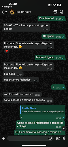 Ou seja: passaram o prazo de entrega sem nem ao menos tirar o pedido. Ainda tentaram justificar dizendo que ‘se eu tivesse pedido pelo link’ eu veria que estavam fechados — sendo que sempre pedi pelo WhatsApp e nunca houve esse problema.