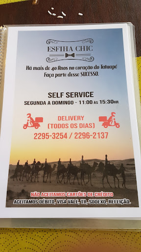 Muito bom! Lugar barato e com comida muito bem servida! Vale a pena! O cardápio oferece várias opções de comidas, desde comida típica arabe até pratos convencionais executivos. Os pratos a la carte servem tranquilamente 2 pessoas. Os sucos de 500ml tem um custo baixo e são muito gostosos! De domingo o movimento é ok e encontra lugar para estacionar nas redondezas. Varios doces abaixo de 10 reais também . Além das opções de esfihas, lanches, pratos e doces do cardápio, o cliente ainda pode escolher o buffet self service, com diversas opções de comidas.