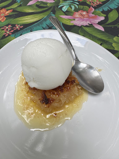A sobremesa é um show à parte: uma combinação equilibrada de cocada cremosa com uma generosa bola de sorvete de limão. A doçura e a textura macia da cocada contrastam perfeitamente com a refrescância e a leve acidez do sorvete, criando uma explosão de sabores tropicais. A apresentação simples, mas elegante, é um convite irresistível ao paladar.