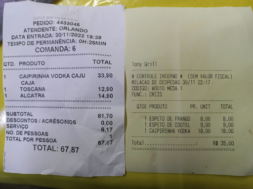 Read moreO ambiente é super agradável, com um atendimento excelente e cardápio com bastante opções (tem até de peixes o que inclui camarão e alguns de vegetais - abobrinha, beringela, brócolis e cebola). Pedi de carne, que você pode optar por fraldinha ou alcatra, de tulipa de frango e linguiça apimentada. Eu pedi o ponto da carne mal passado e os deles é praticamente com a carne selada somente, o que não me desagrada já que estava macio e gostoso, mas para quem torce o nariz para a carne mais crua talvez ao ponto seja a melhor opção. A linguiça apimentada é bem apimentada, gostosa, poderia ser só um pouco mais molhadinha por dentro, enquanto a tulipa estava perfeita. O preço é pouca coisa acima de outros lugares de espeto, mas corresponde ao gasto em restaurantes da região e se eu pudesse sugerir uma mudança, é de colocar rampa em uma das entradas para ser acessível à cadeirantes. Ah, claro, o suco de laranja ksem açúcar) que tomei estava tão bom que tive que repetir o pedido! Como resultado da avaliação eu recomendo o lugar e...