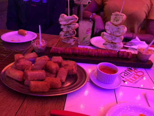 Ao chegarmos no Frango com tudo, nos deparamos com uma instalação precária. Parecia realmente abandonado. A pia para lavar as mãos estava completamente ocupada de baldes com água, parecia estar havendo um vazamento em um dos banheiros. O salão onde fica o karaokê tinha itens que não faziam parte do local, como por exemplo, uma placa enorme de propaganda, parecendo um depósito. O barman, dependendo da cerveja que vc pedia, tinha que buscar em outro freezer em outra parte do restaurante, deixando o balcão sem ninguém. E, por último, as porções de comida não são boas. (A coxinha tem um gosto estranho, a massa tem gosto de trigo não cozido e o recheio parece que colocam muito limão. A porção de batata frita com 4 queijos em cima também não tava muito bom)