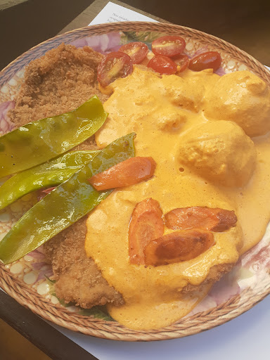 Logo que acabamos a entrada veio a saladinha que acompanha os pratos principais. Mas o paprikaschinitzel veio só 40 minutos depois de pedirmos, e veio morno quase frio.