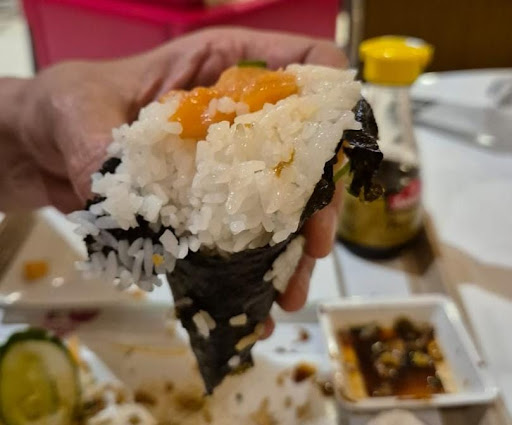 Fui almoçar no shopping Ibirapuera e comprei dois donburi de beringela, um inteiro e um meio — pois sou vegetariano há sete anos.