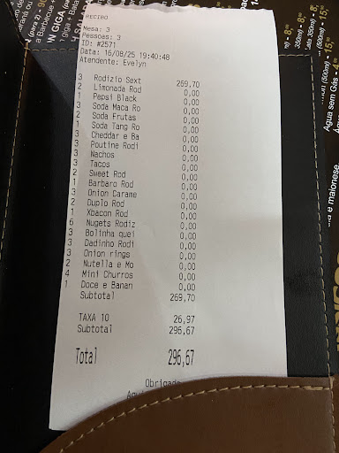 O ambiente deixou a desejar em relação à higiene. A lixeira do banheiro feminino estava com o pedal quebrado, sendo necessário levantar a tampa com a mão. Na cozinha, alguns funcionários estavam com barba grande e poucos usavam touca, o que não passa segurança sobre os cuidados no preparo dos alimentos. Outro ponto negativo foi o cheiro: chegamos às 20h e, perto das 22h, quando começaram a encerrar os pedidos, o ambiente ficou tomado por um odor forte de fumaça e óleo queimado, bem desagradável. Fui com amigos, eles pediram o rodízio e enquanto aguardávamos, pensamos que teria alguns jogos de mesa no local, mas apenas uma Jenga em uma mesa e um baralho detonado na nossa rsrs O refil da limonada deles demorou muito para chegar, quase 45 minutos. O que também fez a experiência piorar, tendo que racionar a bebida da mesa, sendo que era para estar inclusa no rodízio.