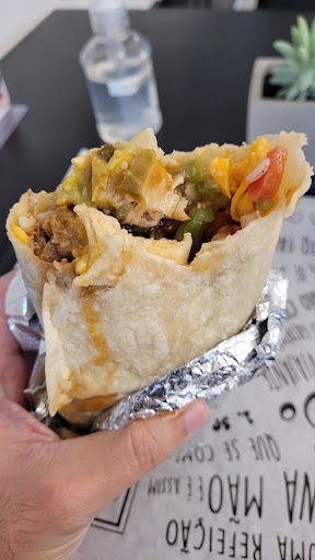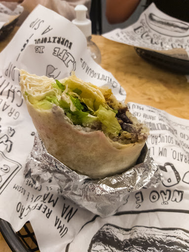 Fiquei meio confusa para escolher por que nao sabia se alface, coentro contavam como acompanhamentos e como eu queria escolhi o mais caro. A tortilha é esquentada e possuem 2 tipos de arroz, 2 de feijao e 6 de carne. O feijão preto vem com canela e achei meio péssimo, como nunca tinha experimentado pedi e me arrependi. As carnes são ok mas pra um prato de 50 reais devia vir mais proteína Sabe quando você come aquele prato bem feito com vários ingredientes e consegue identificar um aqui, um ali, cada um com seu papel? Então, nao acontece nesse. Os sabores se misturam muito, O burrito solta muita água, o burrito é grande e você demora pra comer, então a massa acaba vazando água por baixo. A massa do burrito vem quentinha, dando a impressão que ele esta quente, mas todos os ingredientes estao a temperatura ambiente, o queijo não se derrete e você come aquela bola de queijo. O burrito vem numa vasilha, sei lá, que é péssima, o burrito é pesado e a vasilha nao comporta peso algum. Como você precisa deixar ele levantadinho pros ingredientes não caírem, ela é inútil. Pra descrever ela aqui, parece aqueles potinhos todo furadinho que vem batata frita.