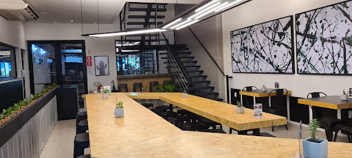 O local é bonito e bem decorado, as mesas poderiam ser melhores, são umas 8 mesas para 2 pessoas e um balcão grande. Eu particularmente gosto da mesa para 4 pessoas por que fica mais confortável. Possui espaço ao ar livre pra comer e segundo andar também que possui 2 mesas para 4 pessoas, lá em cima é meio apertado e o ar condicionado nao esta a ligado. Tem uma varandinha bem fofa no segundo andar. Os banheiros são bem limpos e bonitos, possuem o que acho que todo banheiro deveria ter, álcool ou qualquer substância para limpar o vaso antes de sentar.