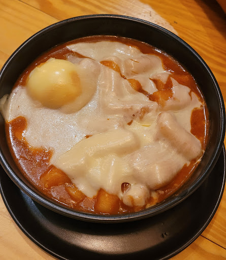 Topokki: sentimos falta dos vegetais e eomuk (ingrediente de peixe) para incrementar no gosto, ponto de melhoria. O queijo derretia bem e o molho estava com uma medida boa entre adocicado e apimentado.