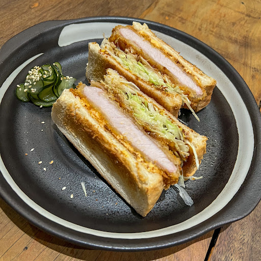 No lugar deles, pedi um katsusando (R$43,00), o sanduíche japonês, aqui com lombo empanado e frito, repolho laminado, maionese de pimenta Sriracha, mostarda Dijon em grãos, molho tonkatsu e pão de leite estilo Hokkaido.