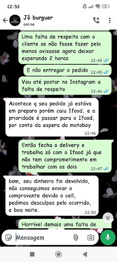 Atendimento horrível fiz um pedido 20:40 fiquei 2 horas esperando mandei mensagem e ainda não tinha saído de lá e ainda falaram que dão prioridade para clientes do Ifood então fica a dica quem for pedir não faça pedido pelo whatsapp pq vai ser muito mal atendimento segue os print da falta de comprometimento...