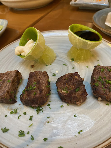Experiência muito ruim levando em conta os valores praticados nesse restaurante! Fomos atendidos pelo garçom Nathanael. Em momento algum se mostrou de bom humor mas também não nos tratou mal. Pra começar, nossos pedidos demoraram bastante pra chegar. Fomos o primeiro casal a entrar no restaurante mas, quando nosso combinado de sushis chegou, já havia muitas pessoas comendo. Pedimos tudo de uma vez: bebidas, duas entradas (uma chegou rápido, a outra demorou) e um combinado de sushis. Vou falar de cada prato: