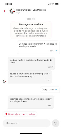 Read moreFiz o meu pedido 23h esse lugar fechava as 00:00 demorou quase 1h mandei msg falando q tava demorando, ai eles falaram pq não tinha motoboy aí passou do horário do prazo mandei dnv eles simplesmente não responderam mais foram embora e fds o meu pedido, pior lugar pra fzr pedido de comida, atendimos um lixo pq nem pra avisar q vão cancelar avisam, tudo um grande lixo, dava 0 se pudesse pois é um descaso com os clientes, eu trabalho em restaurante sei como funciona quando pedem pelo ifood simplesmente cagaram e foram embora sem dizer nada agr fzm 3 HORAS E O IFOOD Q AVISA...