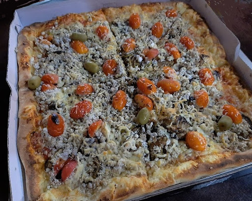 Na sequência eu provei a Pizza quadrada da Linha Premium que além de charmosa é muito saborosa e crocante. Minha opção foi pizza vegetariana (Zucchini) - abobrinha confitada, ricota temperada, tomate cereja e parmesão. É muito boa essa pizza, extremamente bem recheada, suave e muito saborosas. Qualquer vegetariano que experimentar vai amar. Achei incrível!