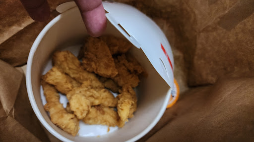 Recebemos o pedido faltando fritas médias e uma tira de frango. As tiras eram minúsculas que praticamente cobriam o fundo do balde.