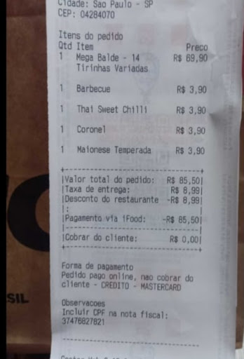 Read moreEstou extremamente insatisfeito com a qualidade da comida e o serviço deste estabelecimento. O "mega balde" está longe de ser mega; paguei 23 reais por batatas de péssima qualidade e em pouca quantidade. Os hambúrgueres, que custam quase 40 reais, são do tamanho de um McLanche Feliz. A comida estava fria, seca e sem gosto algum. O atendimento é deplorável; pedi um refrigerante de 1,5 litro e recebi uma lata. Quando pedi reembolso, o restaurante recusou. Mal posso acreditar que este lugar ainda está aberto. Esta será a última vez que gasto meu dinheiro nesse...