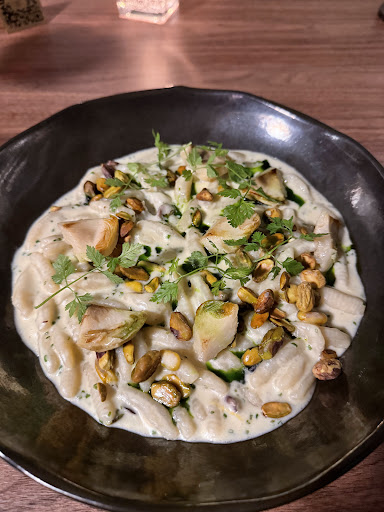 No entanto, infelizmente, a experiência gastronômica ficou muito aquém do esperado – especialmente considerando a proposta premium do local. O atendimento foi educado, mas a equipe claramente não estava bem treinada. Tivemos dificuldades desde o início com o cardápio: duas das entradas que pedimos estavam em falta, e o mesmo aconteceu com a carta de vinhos. Minha primeira e segunda opções de vinho não estavam disponíveis. Quando finalmente conseguimos um rótulo, um branco de R$400, ele foi servido em temperatura ambiente – algo inaceitável nesse nível de restaurante. O vinho foi colocado para gelar longe da mesa, o que exigia a presença constante de um garçom para servir. Infelizmente, por diversas vezes nossas taças ficaram vazias e tivemos que chamar alguém repetidamente para sermos atendidos.