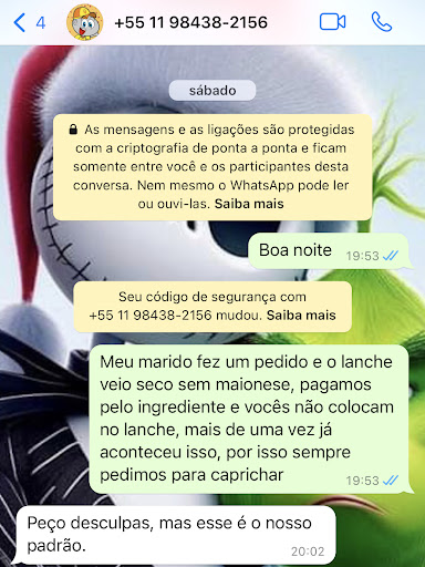 Read moreAdorava o lanche, mas infelizmente hoje em dia o padrão deles mudou, o lanche sempre vem seco, e mesmo nós como clientes dando Feedback, parece que não valeu de nada, você paga e recebe um lanche seco, ao falar com a atendente, ela respondeu arrogantemente que esse é o padrão deles, não ofereceu nenhum tipo de solução, sendo que paguei pelo ingrediente maionese e não veio nem se quer uma gota, enviei foto, mas isso não bastou, simplesmente o ego e a arrogância deles subiu a cabeça, não compro mais lá e já mandei para família, amigos e vizinhos, infelizmente uma decepção nós clientes sermos tratados como se estivéssemos fazendo um favor pra eles, eu paguei pelo lanche, e no cardápio diz que vem o ingrediente, simplesmente eu poderia até mesmo entrar em contato com o procon, só não vou perder meu tempo pq gente assim se afunda sozinha, e meu tempo é muito precioso para perder com esse tipo de pessoa!!!...